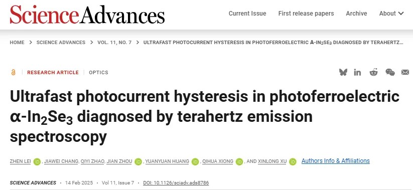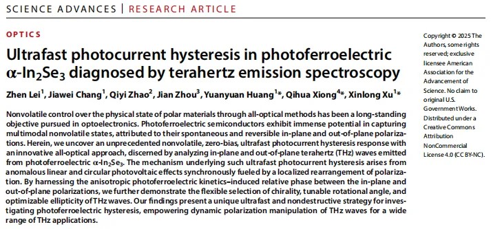 该研究成果以“Ultrafast photocurrent hysteresis in photoferroelectric α-In2Se3 diagnosed by terahertz emission spectroscopy”为题,发表在Science Advances上,雷珍博士为论文第一作者,黄媛媛副教授、熊启华教授(清华大学)、徐新龙教授为共同通讯作者。西安交通大学周健教授在理论分析方面提供重要帮助,我校毕业研究生常佳伟和西安邮电大学赵奇一博士也在研究过程中做出重要贡献。本研究工作受到国家自然科学基金等基金项目的支持。