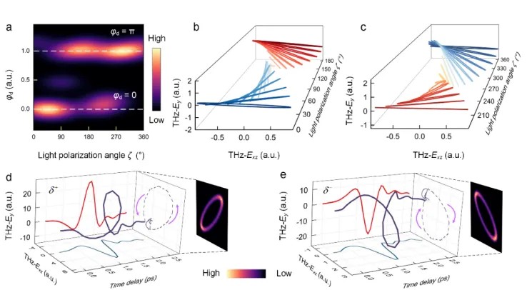 基于上述实验和理论研究,研究团队进一步通过改变泵浦光线偏振角(ζ)或椭圆偏振参数(ψ),实现了对太赫兹波的手性(左/右旋)、旋转角度和椭圆率的灵活调控(图4),最高椭圆度可达0.6。
