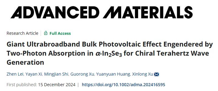团队之前还在国际权威期刊Advanced Materials发表了题为“Giant Ultrabroadband Bulk Photovoltaic Effect Engendered by Two-Photon Absorption in α-In2Se3 for Chiral Terahertz Wave Generation”的研究,该工作利用波长可调的太赫兹发射光谱技术,揭示了光铁电体α-In2Se3中双光子吸收驱动的体光伏效应,成功将体光伏效应的光谱响应范围从紫外-可见光拓宽至红外波段,为开发高性能红外和太赫兹光电器件提供了新的策略。