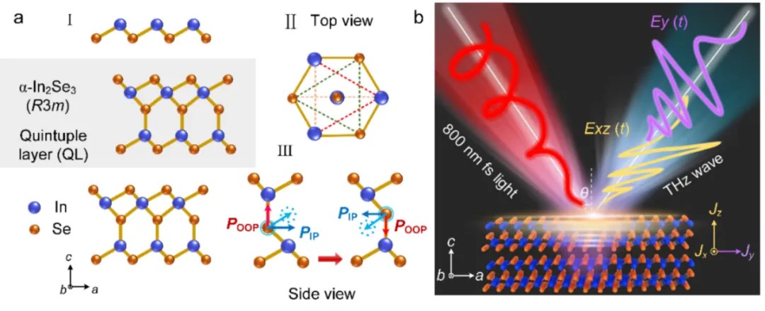 作为一种典型的光铁电半导体,α-In2Se3能够实现可调的自旋、电荷和谷光电流,是研究铁电极化与光电流相互作用的理想平台。图1a所示为光铁电体α-In2Se3的晶格结构,通过中心Se原子的移动可产生沿面内(PIP)和面间(POOP)方向的自发可逆铁电极化。当飞秒激光脉冲光以45°斜入射时,材料通过反常体光伏效应(anomalous bulk photovoltaic effect)产生瞬态光电流,并由此辐射出包含p偏振Exz(t)和s偏振Ey(t)分量的太赫兹波(图1b)。团队系统研究了α-In2Se3面内与面间光电流诱导产生太赫兹波的振幅、相位和极化特性。
