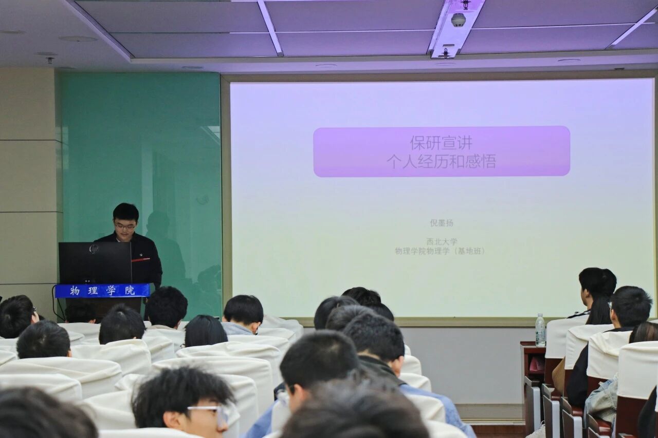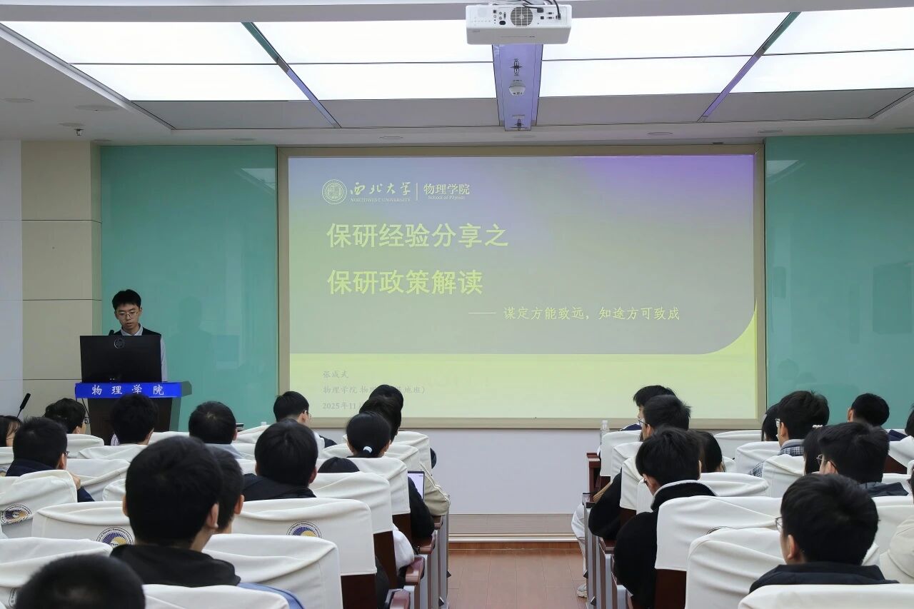 第一位是来自物理学(基地班)的张成武学长(保研至中国科学院大学)。他首先从“什么是保研”谈起,详细解读了西北大学的保研政策。然后他对保研中的创新素质加分项目进行了分类梳理,提醒同学们要合理规划大学阶段的竞赛与科研。最后他强调,要密切关注保研相关通知,特别注意节点的变化以及保研过程中的关键环节,做到“政策心中有数,时间节奏清晰”。