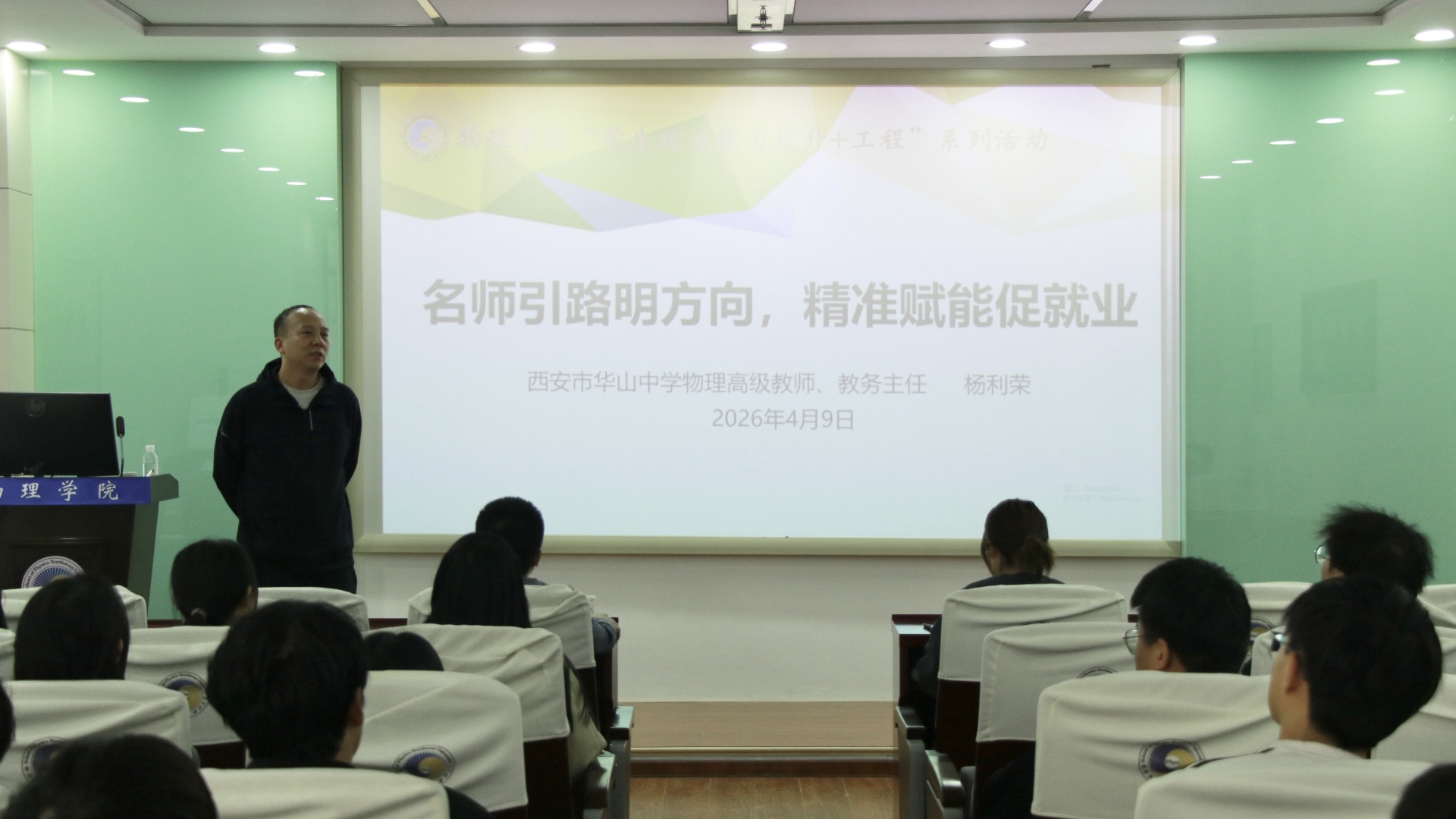 为助力毕业生理解基础教育行业、掌握从教核心素养、提升求职能力,4月9日下午,物理学院举办“学生就业能力提升+工程”系列活动,邀请西安市华山中学高级教师、教务主任杨利荣老师来院开展“名师引路明方向,精准赋能促就业”专题讲座,讲座在学院201劼恒报告厅举行,学院有志于投身初高中教育行业的学生参加了此次讲座,讲座由学院党委副书记兼行政副院长刘斌主持。