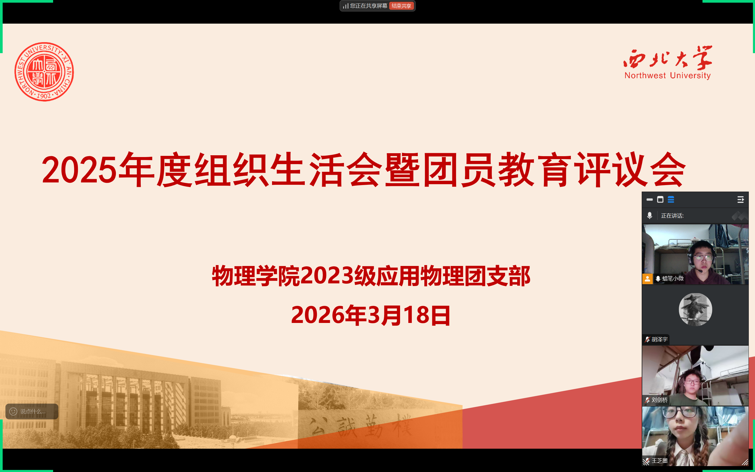 此次组织生活会暨团员教育评议工作,不仅是一次深刻的纪律教育与思想洗礼,更是物理学院团组织激发内生动力、锻造过硬队伍的重要实践。下一步,物理学院团委将持续深化“三会两制一课”制度,以更高标准、更实举措推动全面从严治团向纵深发展,引领广大团员青年将会议焕发出的政治热情转化为砥砺奋进的强大动力,以更加昂扬的姿态投身专业学习与强国建设实践,在推进中国式现代化的征程中贡献青春智慧与力量。