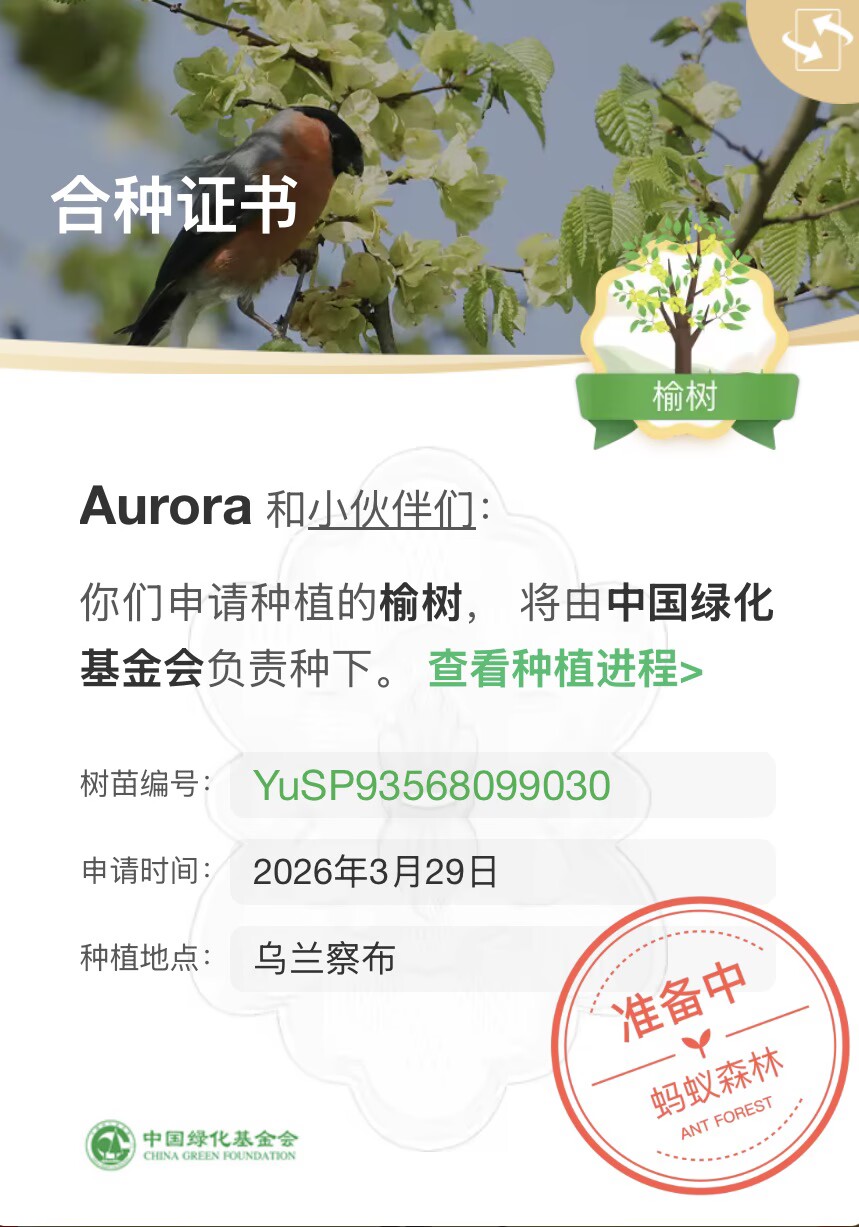 此次植树节线上活动,让同学们在亲身实践中深化环保认知,强化社会责任担当,进一步传播绿色发展理念。大家在点滴行动中践行环保承诺,将生态意识融入日常学习与生活,自觉扛起守护自然的责任。植树造林非一日之功,环保公益亦无终点。本次线上合种活动虽已落幕,但我们守护自然、追求绿色的脚步永不停歇。未来,让我们继续投身生态保护行列,从身边小事做起,节约资源、低碳出行、爱护绿植,让绿色理念扎根生活,让环保成为一种常态与自觉。