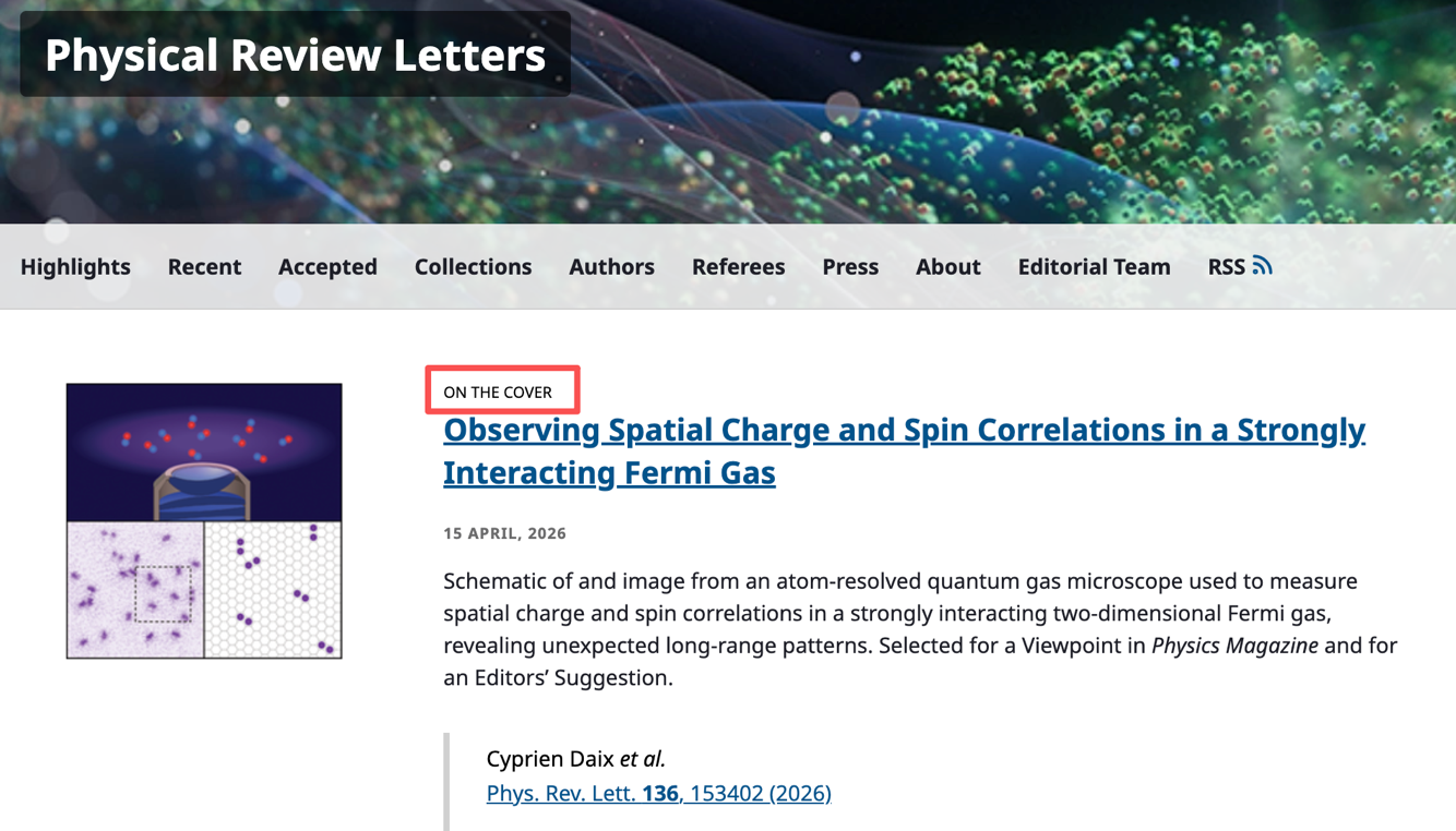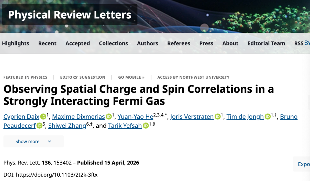 近日,西北大学现代物理研究所何院耀教授团队与合作者在二维相互作用费米气体研究中取得重要进展。研究团队结合量子气体显微镜实验技术和量子蒙特卡洛(QMC)精确计算,系统研究了二维相互作用费米气体的空间电荷与自旋关联函数,揭示了标志费米子配对的关键证据—自旋关联中的非局域反关联现象,并发现该现象超出传统BCS平均场理论的预测;建立了两点与三点关联函数的近似关系,完成了Tan接触参数的高精度测量并与QMC计算结果高度一致。这项研究为理解强关联费米体系中的费米子配对及超流微观机理提供了重要的实验与理论支撑。该研究成果以“Observing Spatial Charge and Spin Correlations in a Strongly Interacting Fermi Gas”为题,于2026年4月15日发表于物理学顶级期刊《物理评论快报》(Physical Review Letters)。该工作不仅同时入选“物理学亮点”(Featured in Physics)和“编辑推荐”(Editors' Suggestion),还被选为当期的封面文章。何院耀教授、美国Flatiron研究所Shiwei Zhang教授、法国卡斯特勒布罗塞尔实验室 Tarik Yefsah教授为论文共同通讯作者。该工作得到了国家自然科学基金委“彭桓武高能基础理论中心”项目、国家自然科学基金项目以及陕西省青年创新团队的支持。