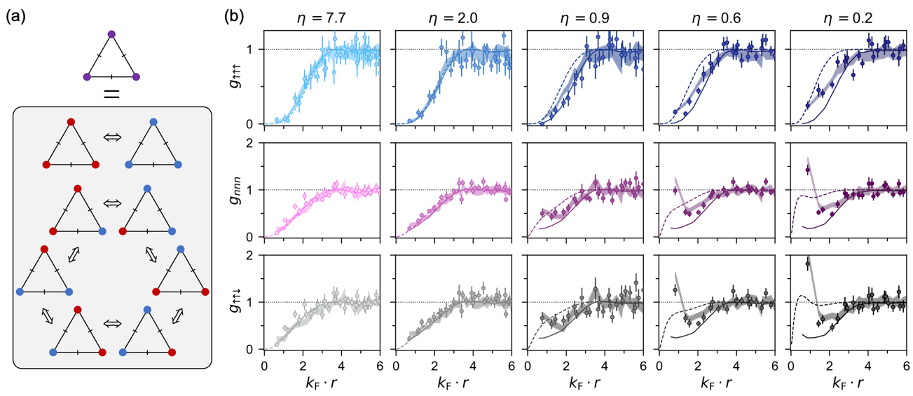 (2)发现等边三角形上的三点关联函数,可以通过赝Wick展开公式用两点关联函数表示出来,并通过实验数据和理论计算结果均验证了该近似公式在BCS到BEC整个区域的高度精确性(如图3所示)。这一结果表明主导该体系量子多体行为的是两体关联函数,三体关联函数(等边三角形上)几乎没有独立的新信息。