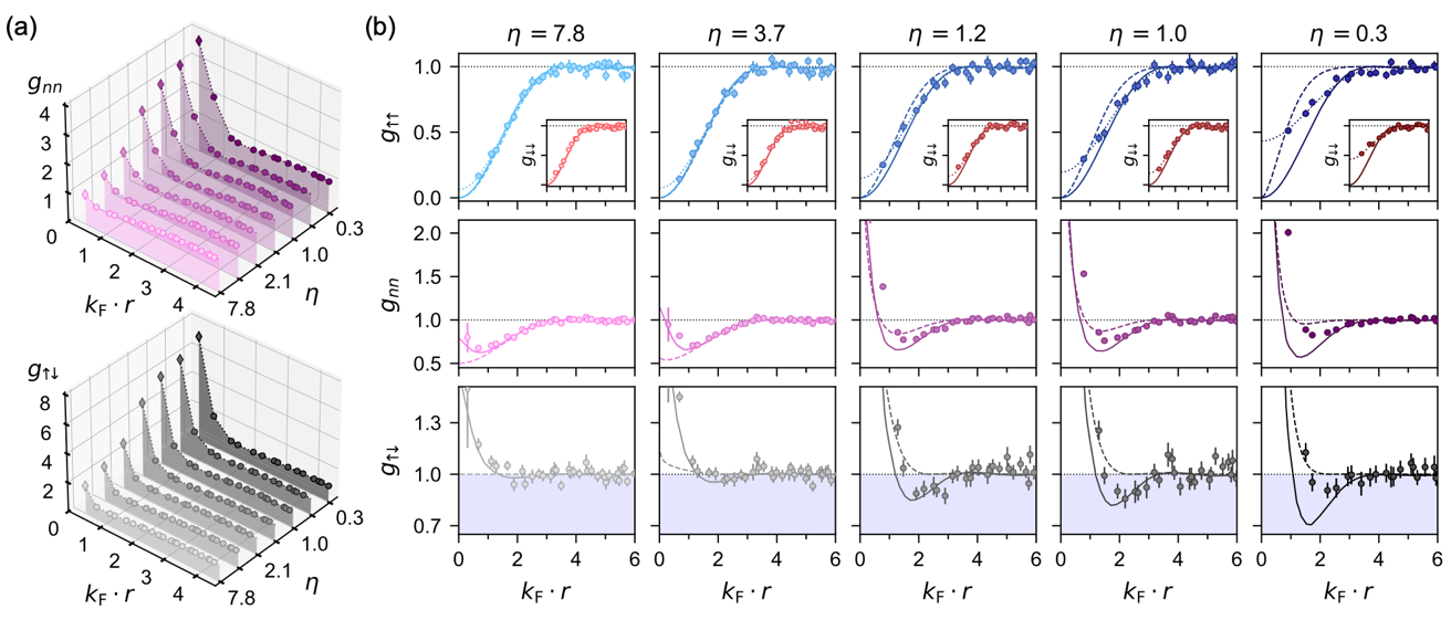 (1)通过实空间电荷关联函数,清晰呈现了该体系的BCS-BEC渡越行为;在相反自旋关联函数中观察到费米子配对的标志性现象——非局域反关联现象,且该现象完全超出传统BCS平均场理论的预测(即使是在弱相互作用的BCS区域),如图2所示。此外,还观察到相同自旋的关联函数结果在BCS区域到渡越区,都与理想费米气体结果高度一致。这些发现对传统BCS理论提出了新的挑战。