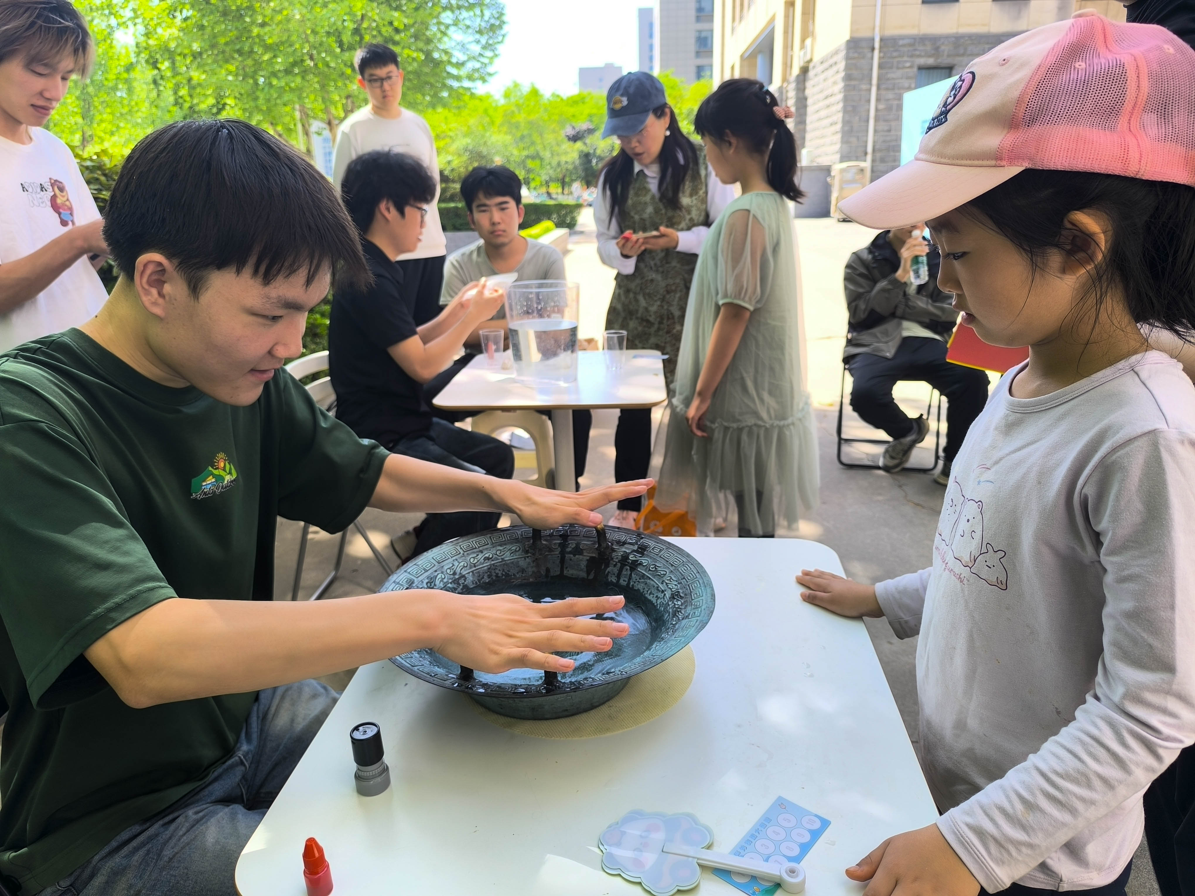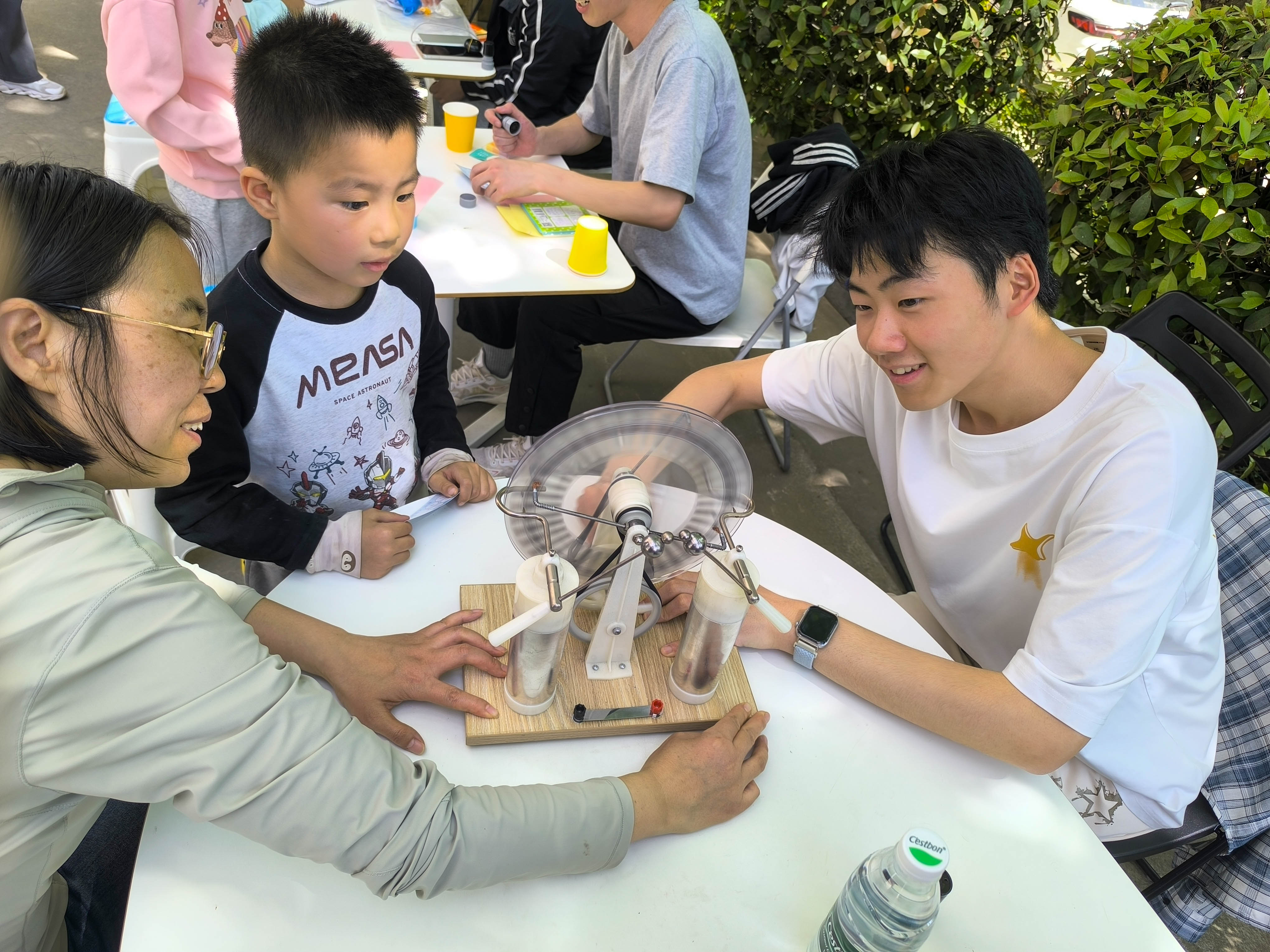 活动现场,十大趣味实验将抽象的原理化为生动体验:空气大炮轰出强劲气流;乒乓球加特林上演连发好戏;鱼洗盆中水花随共振跃起,车轮陀螺展现旋转的定轴与进动特性;硬币跳水诠释惯性,马德堡半球让人亲身感受大气压力的震撼;还有“不会湿的纸巾”“静电起电机”和缓缓转动的“气球摩天轮”等等奇妙的现象引得孩子们连连惊叹,在亲手触摸和亲眼见证中,共振、气压、力学等知识变得鲜活可感。活动还设置了集章打卡和物理快问快答环节。孩子们手持集章册,穿梭于各个实验站,完成体验即可收集专属印章,答对问题还能获得精美科普贴纸。集满10枚印章后,可兑换趣味科技小制作一份。在闯关过程中,孩子们主动思考、积极发问,在成就与欢笑中轻松收获知识。从实验讲解到操作指导,从秩序维护到奖品发放,西北大学物优无虑启新社全体成员分工明确、耐心细致。他们用通俗易懂的语言拆解物理原理,用温柔细心的引导陪伴孩子操作,全程守护活动安全与秩序,用热情与专业为孩子们打造沉浸式科普体验,让科学探索变得轻松又有趣。