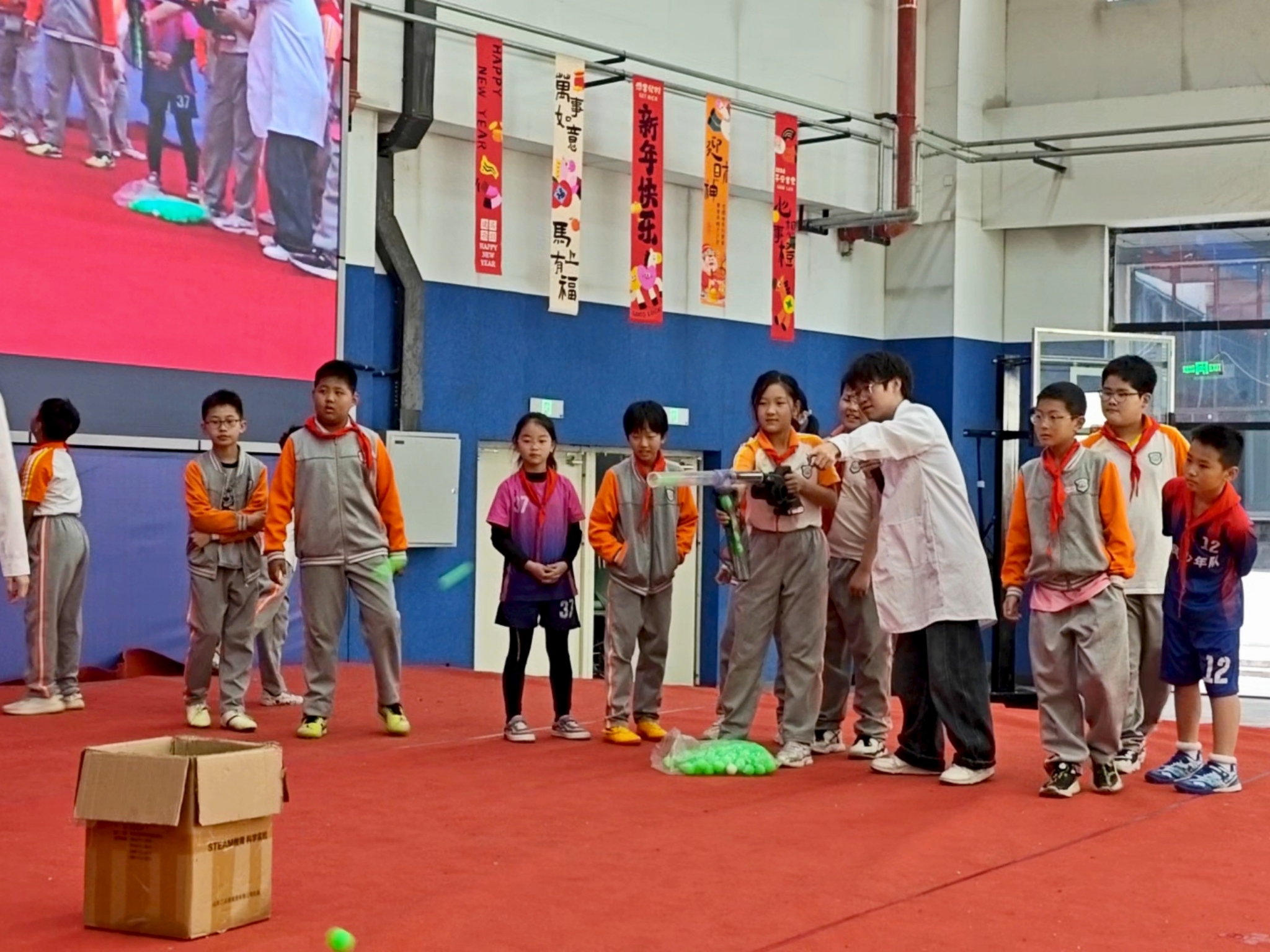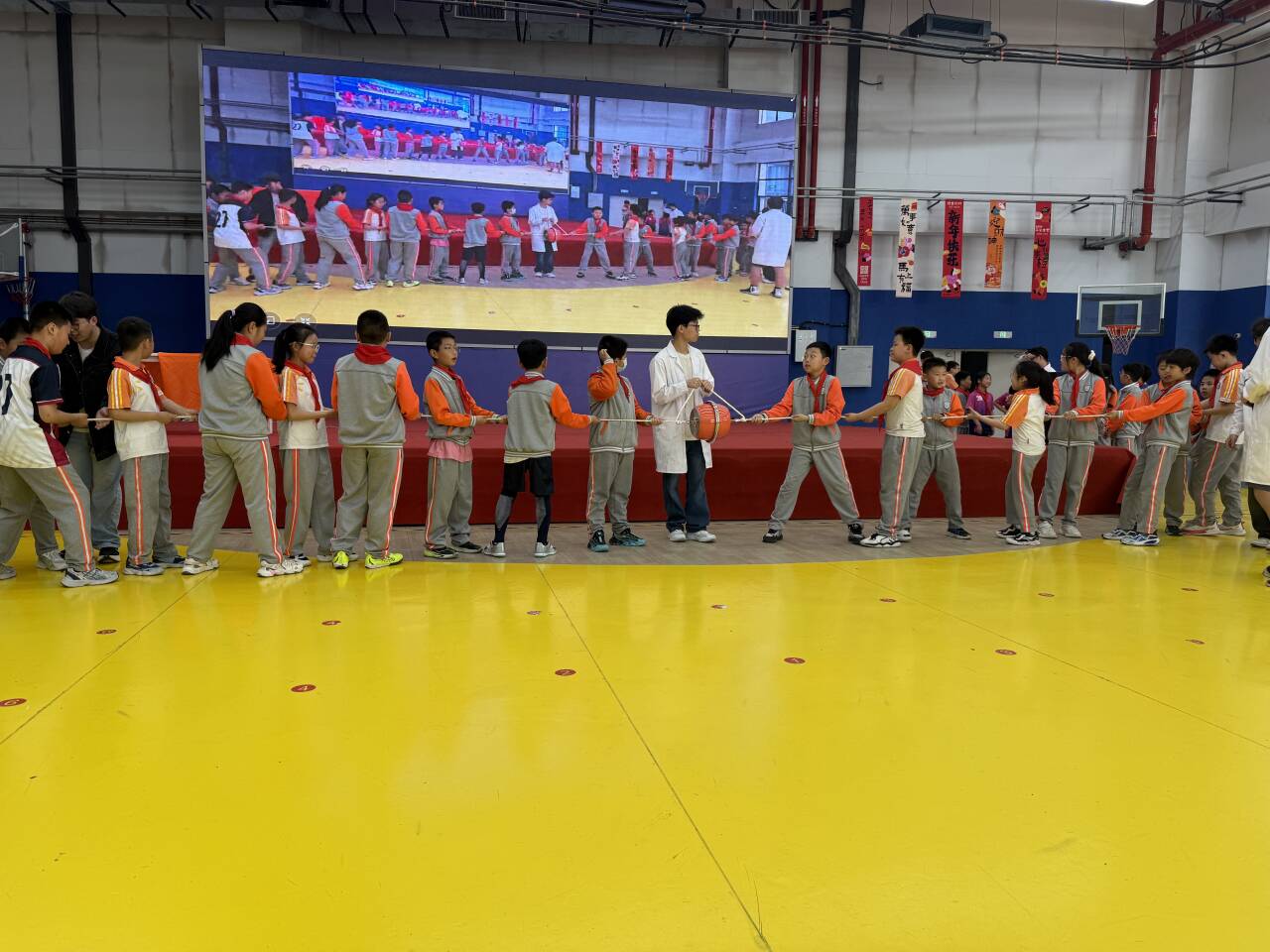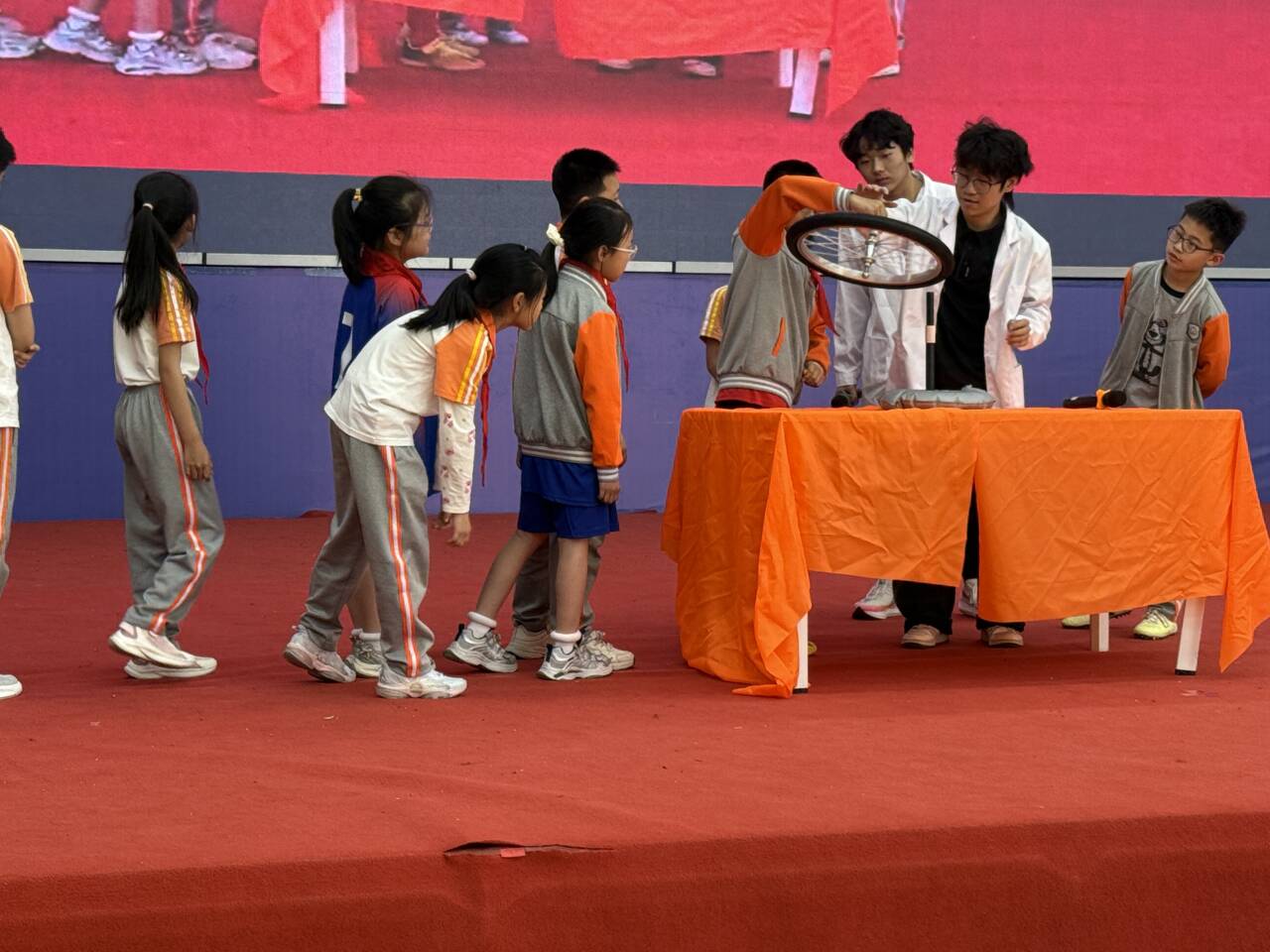 活动一开始,双锥体沿V形轨道缓缓“上坡”的奇观,便引发了阵阵疑惑与讨论——原来轨道巧妙拓宽,使重心逐渐降低,重力势能默默完成了一次“反直觉”的搬运。随后,古老的鱼洗盆在摩擦下泛起跳跃的水花,将无形的声波共振化作可见的涟漪。空气炮轰出清晰的涡环,瞬间击倒纸杯塔,展示了气流蕴藏的威力;而利用气压差连续发射乒乓球的装置,则让伯努利原理在欢声笑语中化身为一场激烈的趣味比赛。同学们亲手推拉高速旋转的轮胎,亲身体会角动量守恒的“固执”;又在马德堡半球实验中,十余人齐心协力仍难以拉开抽成真空的金属半球,直至进气阀门打开,“嗤”的一声轻响,半球才轻松分离——大气压强那看不见却真实存在的巨力,让全场瞬间沸腾。从“上坡”的双锥到“炸开”的水花,从“空气拳”到“固执”的陀螺,每一个环节都紧紧抓住了孩子们的目光。他们在观察中好奇,在互动中发问,在亲手体验中感受物理的生动与深邃。原本隐藏在公式背后的力量,通过这场科学秀变得清晰而有趣。