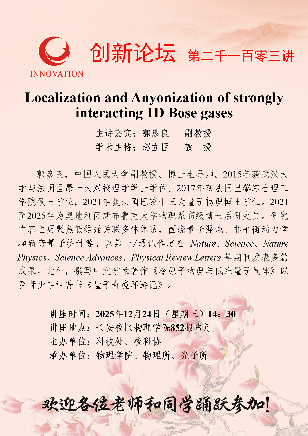 西北大学创新论坛第二千一百零三讲:Localization and Anyonization of strongly interacting 1D Bose gases